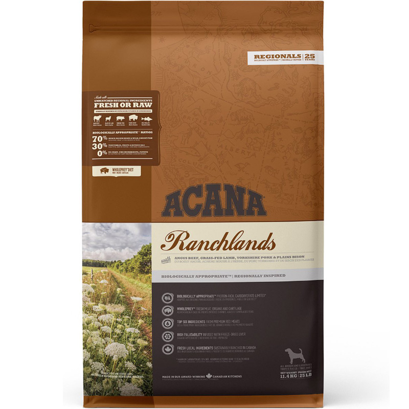 Elk ACANA®-recept is van begin tot eind zorgvuldig samengesteld met hoogwaardige ingrediënten. Met het hoogste eiwitaanbod in ACANA-voer voor huisdieren, is ons ACANA Highest Protein Ranchlands®-recept rijk aan 70% hoogwaardige dierlijke ingrediënten zoals op de boerderij gekweekt rundvlees, varkensvlees, lam, zoetwatervis uit een meer en bizon, uitgebalanceerd met 30% fruit, groenten en plantaardige producten, velen dagelijks geleverd. Kunstmatige kleur-, smaak- of bewaarmiddelen worden in onze keuken nooit toegevoegd. Onze eersteklas ingrediënten zijn afkomstig van een samengestelde groep boeren, veeboeren en vissers die we al tientallen jaren kennen en vertrouwen, en we benaderen elke batch met een onovertroffen toewijding aan veiligheid en kwaliteit. Het resultaat is een eiwitrijk, voedzaam en heerlijk hondenvoer om hen te helpen een gezond en gelukkig leven te leiden. De eerste DRIE ingrediënten zijn vers of rauw rundvlees, lamsvlees en varkensvlees, waardoor dit recept voedzaam is, met ons hoogste eiwitaanbod. Omvat verse of rauwe groenten en fruit zoals boerenkool, hele pompoen, pompoen, wortelen, appels en peren, allemaal voedzaam en vezelrijk. Geen toegevoegde graaningrediënten, soja, maïs, tarwe of tapioca. Omhuld met gevriesdroogd rundvlees en lever voor een heerlijke smaak waar uw hond naar zal snakken. Vervaardigd in Canada met de beste ingrediënten ter wereld.