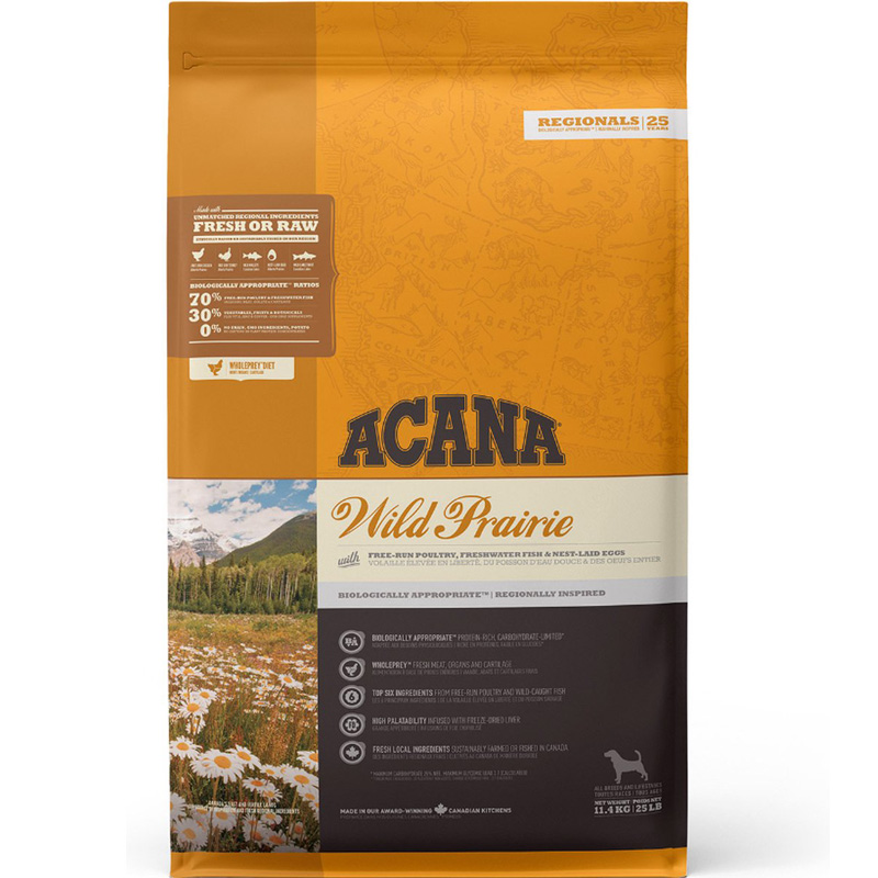 Elk ACANA®-recept is van begin tot eind zorgvuldig samengesteld met hoogwaardige ingrediënten. Met het hoogste eiwitaanbod in ACANA-voer voor huisdieren, is ons ACANA Highest Protein Wild Prairie®-recept rijk aan 70% hoogwaardige dierlijke ingrediënten zoals scharrelkip en kalkoen, in het wild gevangen en duurzaam gekweekte vis, uitgebalanceerd met 30% fruit, groenten, en plantaardige producten, waarvan vele dagelijks worden bezorgd. Kunstmatige kleur-, smaak- of bewaarmiddelen worden in onze keuken nooit toegevoegd. Onze eersteklas ingrediënten zijn afkomstig van een samengestelde groep boeren, veeboeren en vissers die we al tientallen jaren kennen en vertrouwen, en we benaderen elke batch met een onovertroffen toewijding aan veiligheid en kwaliteit. Het resultaat is een eiwitrijk, voedzaam en heerlijk hondenvoer om hen te helpen een gezond en gelukkig leven te leiden. De eerste DRIE ingrediënten zijn verse of rauwe kip en kalkoen, waardoor dit recept voedzaam is, met ons hoogste eiwitaanbod. Omvat verse of rauwe groenten en fruit zoals boerenkool, hele pompoen, pompoen, wortelen, appels en peren, allemaal voedzaam en vezelrijk. Geen toegevoegde graaningrediënten, soja, maïs, tarwe of tapioca. Omhuld met gevriesdroogde kip en lever voor een heerlijke smaak waar uw hond naar zal snakken. Vervaardigd in Canada met de beste ingrediënten ter wereld.