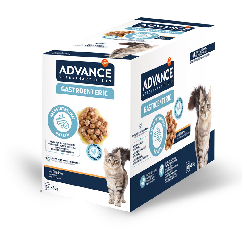 Advance Veterinary Diets Gastroenteric/Spijsvertering is een compleet dieetvoer voor katten die een slechte spijsvertering hebben. Dit natvoer is gemaakt van ingrediënten die makkelijk te verteren zijn, heeft een lager vezelgehalte en een hoger natrium- en kaliumgehalte. Het product bevat zorgvuldig gekozen eiwitten die de spijsvertering bevorderen en prebiotica die helpen om een gezonde darmflora te ontwikkelen.