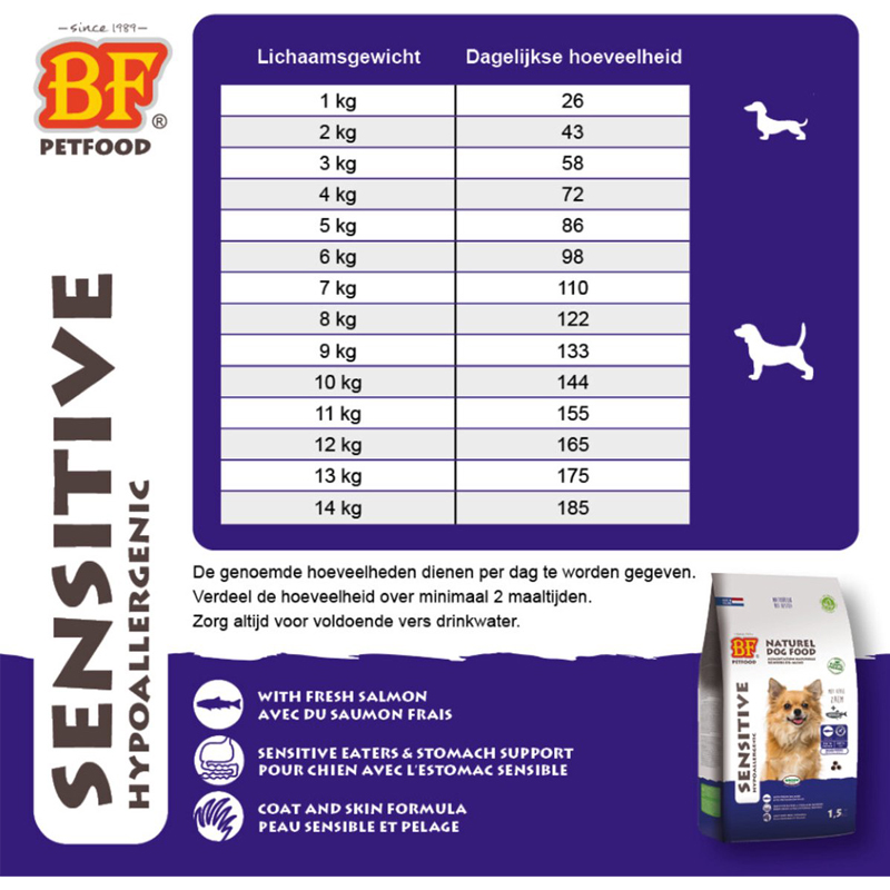 BF Petfood Adult Sensitive Small Breed is een hoogwaardige volledige smaakvolle graanvrije premium hondenvoeding voor voedselgevoelige en/of kieskeurige pups en volwassen honden van kleine rassen.