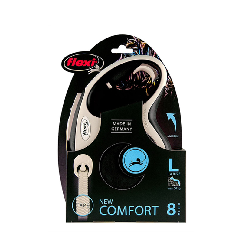 De Flexi Rollijn New Comfort Tape Zwart Zwart L 8 meter is een lange looplijn op rol in behuizing van het bekende Flexi, met blokkeerfunctie en soft grip. Flexi is al jarenlang een gerenommeerde naam op het gebied van hondenlijnen met een oprolfunctie. De kwaliteit van Flexi wordt onder andere bepaald door de unieke dubbele remtechniek, de duurzaamheid van houder en lijn en het gebruiksgemak. Door het oprolmechanisme is de Flexi een ideale lijn om uw hond bewegingsvrijheid te geven, en daarnaast kort(er) te houden als dat nodig is. Je kunt de lijn vastzetten, maar ook met een simpele beweging tijdelijk blokkeren. Door de stevige behuizing heb je lang plezier van deze rollijn. De new comfort is voorzien van een 'soft grip', een zachter handvat voor meer comfort tijdens het uitlaten. Geschikt voor honden tot 50 kg.