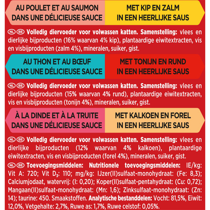 Samenstelling: Met Kip en Zalm: Vlees en dierlijke bijproducten (16% waarvan 4% kip), plantaardige eiwitextracten, vis en visbijproducten (zalm 4%), mineralen, suiker, gist. Met Rund en Tonijn: Vlees en dierlijke bijproducten (15% waarvan 4% rund), plantaardige eiwitextracten, vis en visbijproducten (tonijn 4%), mineralen, suiker, gist. Met Kalkoen en Forel: Vlees en dierlijke bijproducten (12% waarvan 4% kalkoen), plantaardige eiwitextracten, vis en visbijproducten (forel 4%), mineralen, suiker, gist.