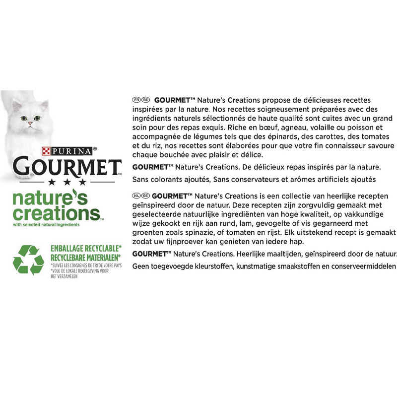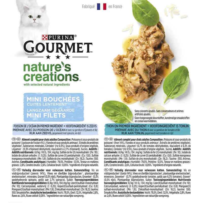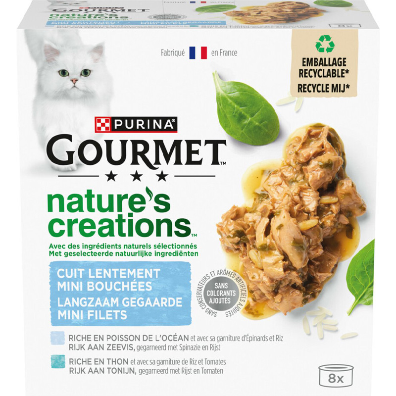 De Gourmet Natures Creations Filet Zeevis is een complete natvoeding voor katten, geïnspireerd door de natuur en bereid met zorgvuldig geselecteerde ingrediënten. Deze variant bevat langzaam gegaarde mini filets met zeevis en tonijn, gecombineerd met spinazie en rijst. De zachte structuur en verfijnde smaak sluiten aan bij katten met een kieskeurige eetlust. De blikjes bevatten geen toegevoegde kunstmatige kleur- en smaakstoffen of conserveringsmiddelen.