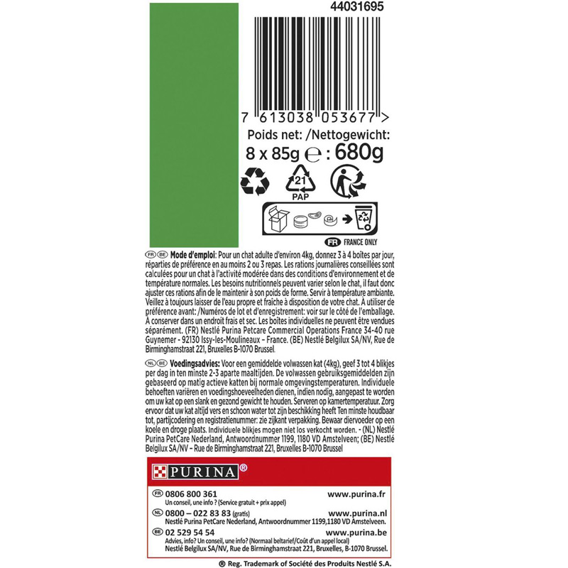 Samenstelling: Met zeevis: Vis en visbijproducten* (zeevis 14%), vlees en dierlijke bijproducten*, plantaardige eiwitextracten, mineralen, granen* (0,5% rijst), plantaardige bijproducten, groenten* (0,3% gedehydreerde spinazie, gelijk aan 2,7% spinazie), suiker. Met tonijn: Vis en visbijproducten* (tonijn 14%), vlees en dierlijke bijproducten*, plantaardige eiwitextracten, groenten* (0,7% gedehydreerde tomaten, gelijk aan 6,3% tomaten), mineralen, granen* (0,5% rijst), plantaardige bijproducten, suiker. *Natuurlijke ingrediënten.