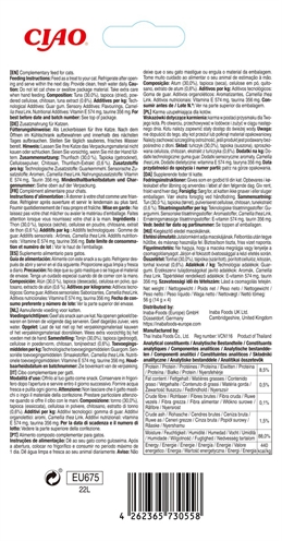 Analytische bestanddelen: Ruw eiwit (min) 7%, ruw vet (min) 0,2%, ruwe vezels (max) 0,6%, vocht (max) 88%, Vitamine E (min) 310IU/kg, taurine (min) 0,025%
