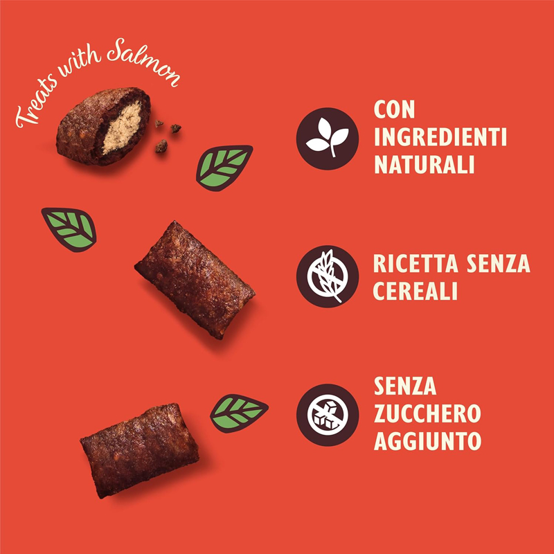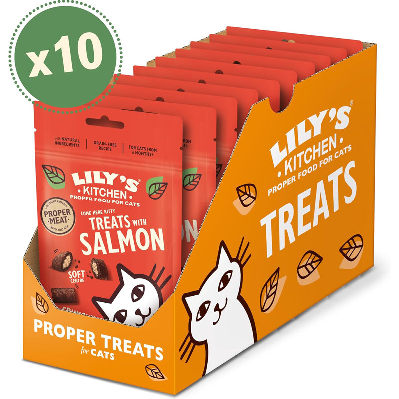De Lily's Kitchen Salmon Treats 60 gr is heerlijk aanvullend voer voor de kat, lekkere snacks met een knapperige buitenkant en zachte binnenkant met zalm en kippenlever, natuurlijk en zonder toevoegingen. Verwen je kat met deze heerlijke kattensnacks van Lily's Kitchen! Deze heerlijke snacks zijn gemaakt met volledig natuurlijke ingrediënten, zoals kippenlever en zalm. De snacks hebben een heerlijke knapperige buitenkant en zachte binnenkant, voor de ultieme smaaksensatie. De snacks bevatten geen toegevoegde suikers en zijn graanvrij!