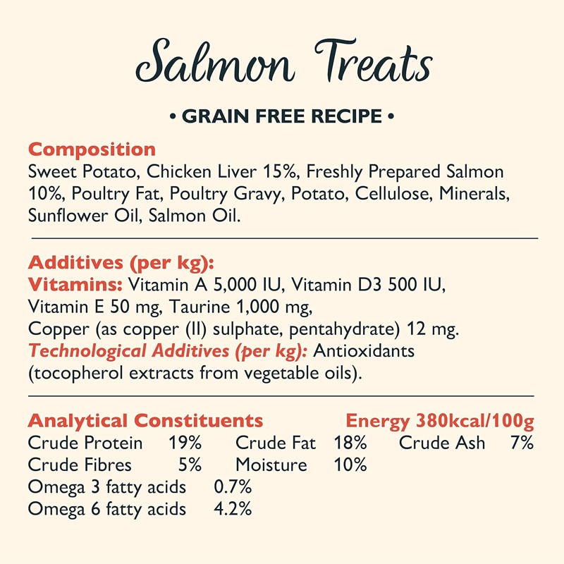 Samenstelling: Zoete Aardappel, Kippenlever 15%, Vers Bereide Zalm 10%, Gevogeltevet, Gevogeltejus, Aardappel, Cellulose, Mineralen, Zonnebloemolie, Zalmolie