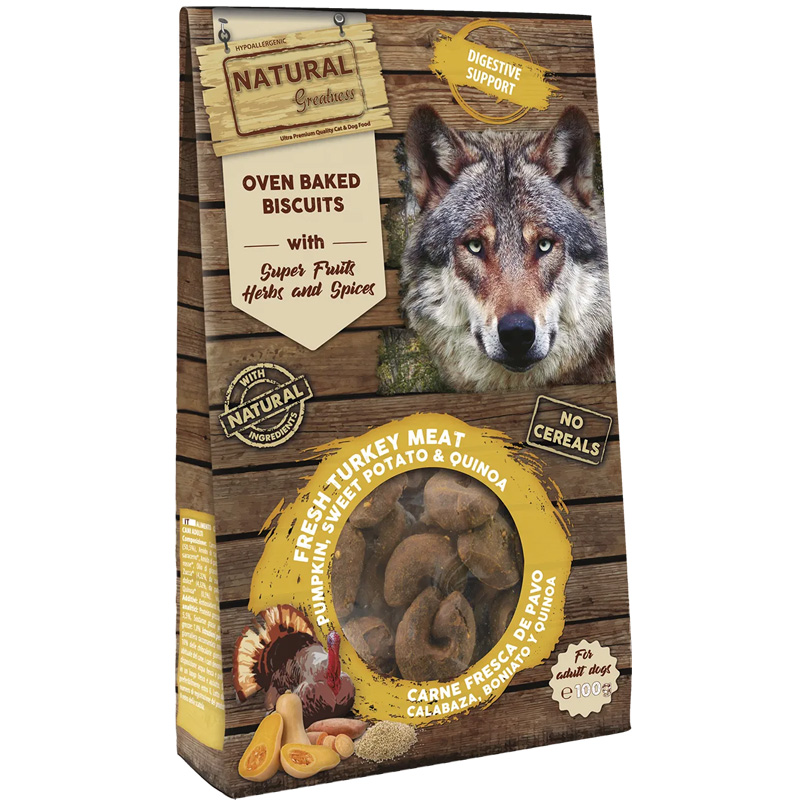 Natural Greatness Digestive Support Oven Baked Biscuits zijn natuurlijke, hypoallergene en graanvrije gebakken koekjes geschikt om als prijs of beloning te geven aan volwassen honden. Naast hoogwaardig kalkoenvlees als hoofdingrediënt bevat deze snack pompoen, zoete aardappel en quinoa, drie ingrediënten die de goede werking van het spijsverteringsstelsel van de hond stimuleren.