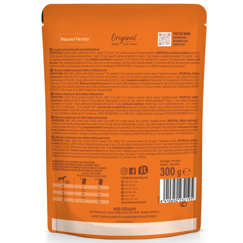 Nature's Variety Original Adult Medium /Maxi Pouch Chicken No Grain 300 gr een compleet graanvrij natvoer voor volwassen honden van middelgrote en grote rassen, met gestoomde hoge kwaliteit kip als hoofdingrediënt.