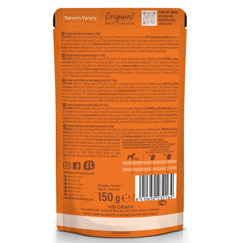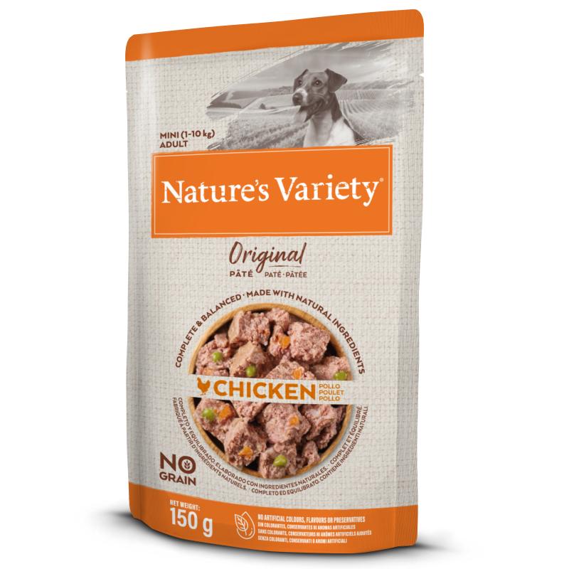 Natures Variety Original Mini Pouch Chicken 8X150 gr een compleet graanvrij natvoer voor volwassen honden van kleine rassen, met gestoomde hoge kwaliteit kip als hoofdingrediënt.
