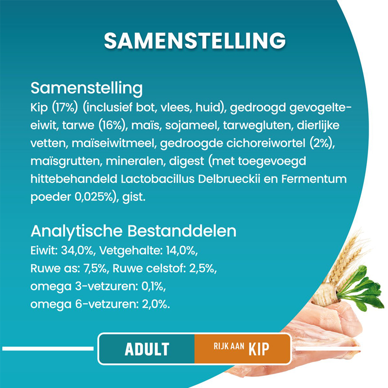 Samenstelling: Kip (17%) (inclusief bot, vlees, huid), gedroogd gevogelte-eiwit, volkoren tarwe (16%), maïs, sojameel, tarwegluten, varkensvet, maïseiwitmeel, gedroogde cichoreiwortel (2%), maïsgrutten, mineralen, digest (met toegevoegd hittebehandeld Lactobacillus delbrueckii en fermentum poeder 0,025%), gist