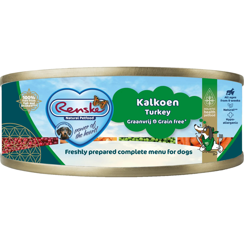 Renske Vers Vlees Kalkoen Graanvrij 24 x 95 cm is compleet natvoer voor de hond, 100% natuurlijk met vers bereid vlees of vis en vrij van gluten. De vers bereide maaltijden van Renske bevatten alles wat jouw hond nodig heeft. Deze smakelijke maaltijden met hoogwaardige ingrediënten zijn 100% natuurlijk, licht verteerbaar en verrijkt met duindoorn, gedroogde algen en yucca schidigera. Daarnaast bevat het voer alle benodigde anti-oxidanten, vitaminen en mineralen voor een gezonde hond en draagt zo bij aan een goede ontwikkeling van de hersenen, het herstellende vermogen van de huid en een goede spijsvertering en sterk immuunsysteem. Elke variant bevat tussen de 40% en 65% vers vlees en is daardoor ook nog eens zeer smakelijk. Bovendien zijn deze maaltijden ook een uitkomst voor de baas, omdat ze zeer makkelijk in gebruik zijn: de maaltijd kan na openen drie dagen in de koelkast bewaard worden en hoeft niet ingevroren te worden. Zonder kunstmatige toevoegingen en suiker en zout!