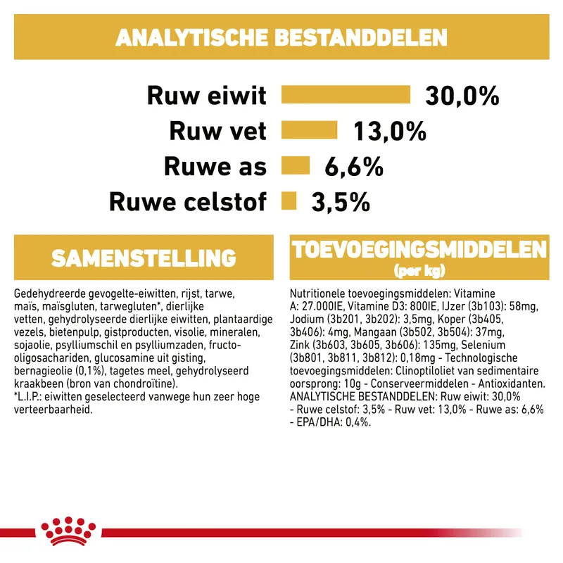 Samenstelling: rijst, maïs, gedehydreerde gevogelte-eiwitten, maïsgluten, dierlijke vetten, hydrolysaat van dierlijke eiwitten, plantaardige vezels, mineralen, bietenpulp, visolie, sojaolie, psylliumschil en psylliumzaden, Fructo-Oligo-Sacchariden, hydrolysaat van schaaldieren (bron van glucosamine), bernagieolie (0,1%), Tagetes (Afrikaan) extract (bron van luteïne), hydrolysaat van kraakbeen (bron van chondroïtine), gedehydreerd runder- en varkenseiwit*, tarwe, gist en delen daarvan *L.I.P.: hoogwaardige eiwitten die zeer goed verteerbaar zijn.