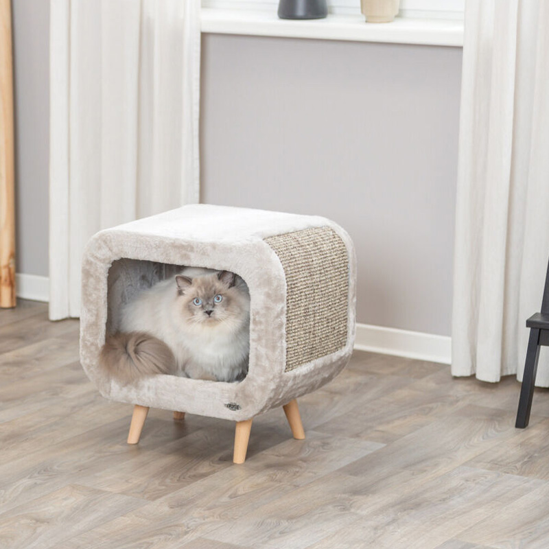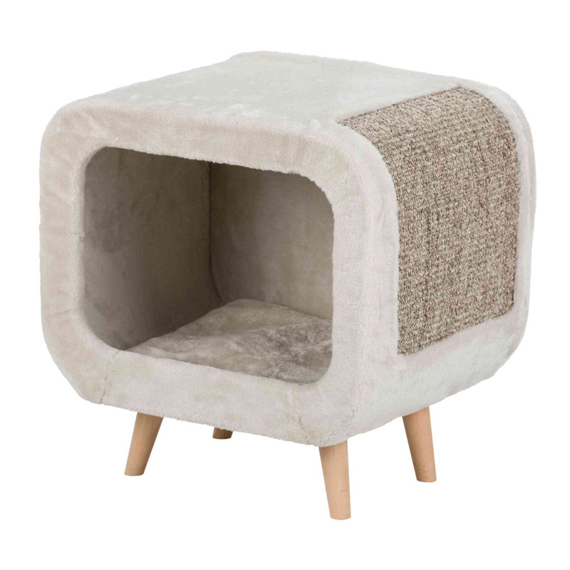 Het Trixie Alicia Relax Huis Lichtgrijs/Grijs Gemêleerd 48X48X38 cm is een schuilplaats en kattenmand in één! In dit leuke schuilhutje kan jouw kat lekker relaxen. Dit gezellige huisje is bekleed met pluche en voorzien van een sisal-krabvlak. Het huisje functioneert zo ook als een soort kleine krabpaal, daar de kat ook zijn of haar nagels er lekker aan kan scherpen. In de schuilruimte kan de kat zich verstoppen en heerlijk slapen op de bekleding van pluche. In de schuilhut vind je een wendbaar kussen voor meer comfort. Ook kan je kat ervoor kiezen om op het kattenhuis te gaan liggen voor wat meer overzicht. Tot slot staat dit relax-schuilplaatsje leuk in je huis door de speelse vorm en beukenhouten pootjes.