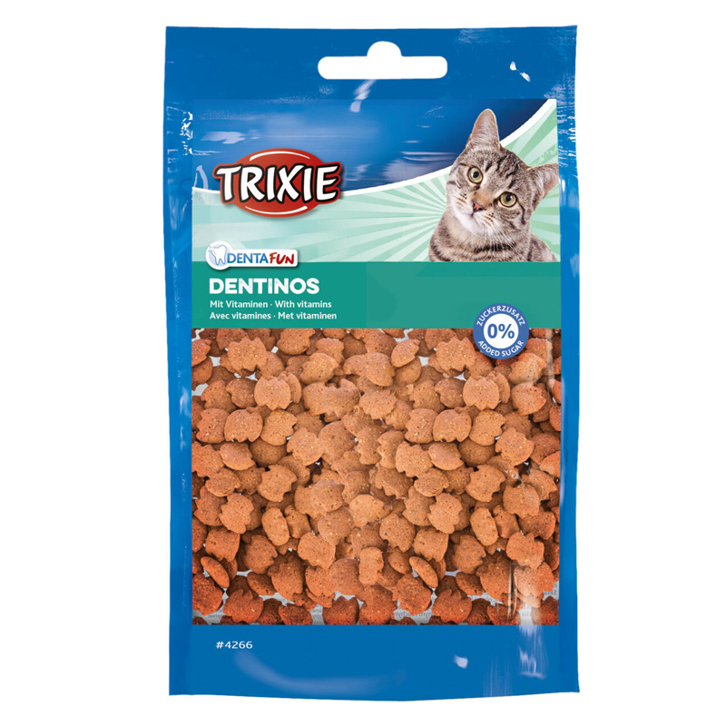 Trixie Denta Fun Dentinoes Met Vitamines 50 gr zijn aanvullend diervoeder, smakelijke kattensnoepjes die een gezond gebit ondersteunen en gevuld zijn met vitaminen. Een lekkere en verantwoorde snack voor jouw kat! Door de bijzondere vorm en consistentie helpen deze lekkere snacks het gebit van jouw kat te verzorgen. Het materiaal wrijft langs de tanden bij het kauwen en helpt zo vuil en bacteriën te verwijderen, waardoor tandplak en tandsteen verminderd worden. De snoepjes zijn ook rijk aan vitaminen en dus een verantwoord tussendoortje. Zonder toegevoegde suikers!