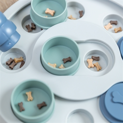– Met schuifdeksels en kommetjes waaronder de hond naar zijn beloning moet zoeken