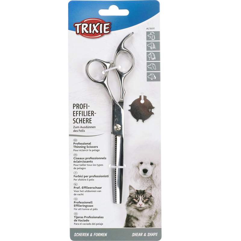 De Trixie Effileerschaar Enkelzijdig Professioneel 18 cm is een schaar van RVS voor het uitdunnen van de vacht. Onmisbaar voor (thuis)trimmers! Deze schaar is voorzien van een stelschroef en rubberen stoppertjes, die zorgen voor geluidsarm hanteren van de schaar. Dit is niet alleen fijn voor de trimmer, maar ook voor honden die wat nerveus zijn wanneer zij getrimd worden.
