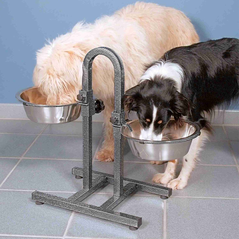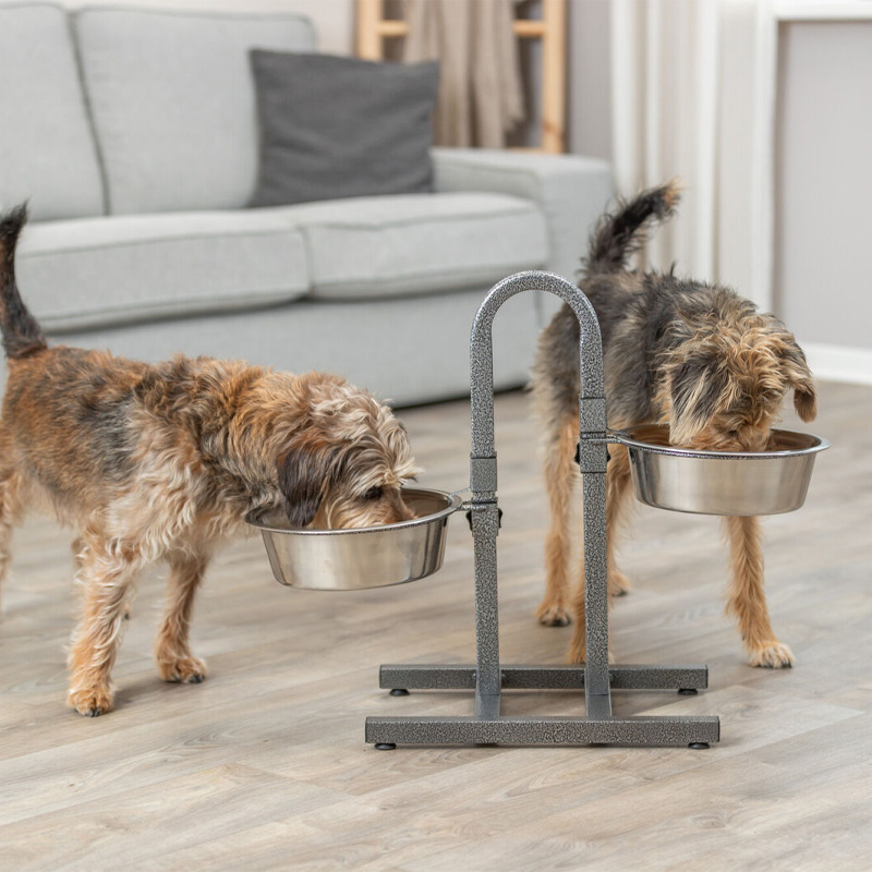 Dit is een ideale voerstandaard voor mensen die graag zelf de hoogte van de voer- en drinkbakken van hun dieren instellen. Deze H-vormige standaard is vernist en heeft aan beide zeiden een voer- en drinkbak bevestigd. Je kunt de hoogte van de bakken bepalen door de standaard te verstellen, door de handige draaiknoppen boven en onder in te stellen zoals jij ze wilt hebben. Om het nog makkelijker te maken, kun je de bakken los van elkaar verschuiven, zodat de hoogte verschillend kan zijn. Door deze hoogte goed op jouw dier af te stemmen, help je jouw hond zijn eten beter te verteren.