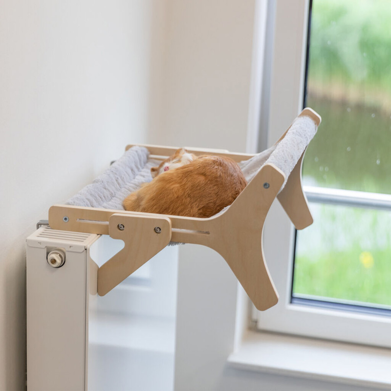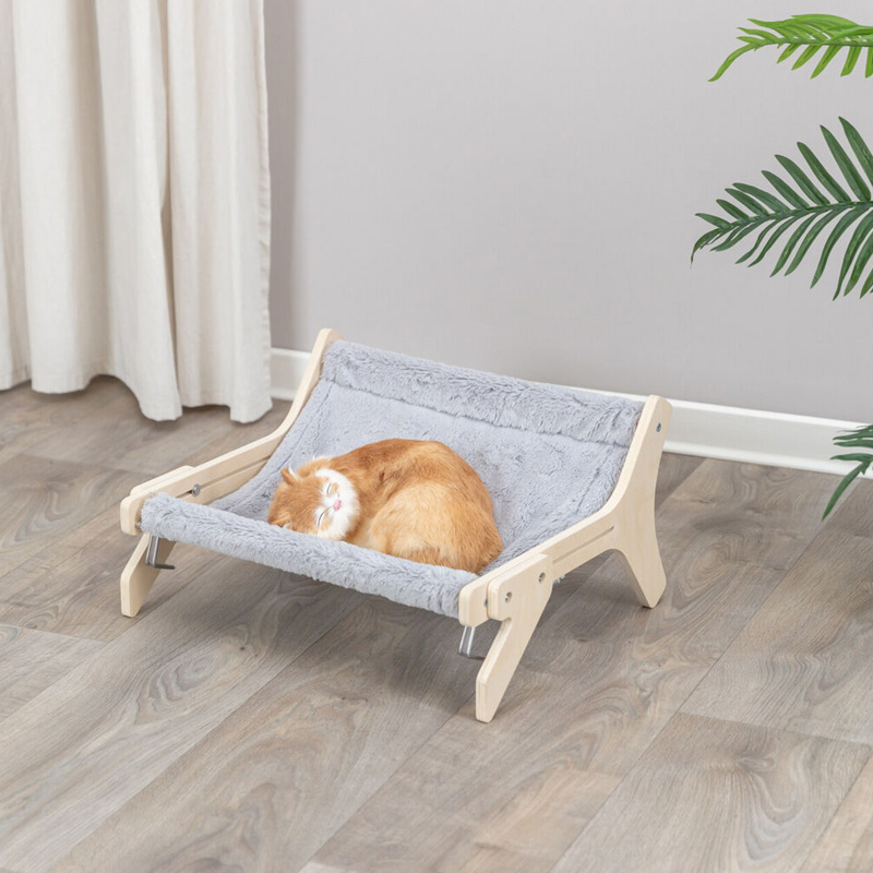 De Trixie Hangmat Hout Onbehandeld Grijs biedt jouw kat een luxe en comfortabele rustplek met veelzijdige bevestigingsopties. Deze stijlvolle hangmat kan vrijstaand worden gebruikt of eenvoudig worden bevestigd aan een bedframe of verwarming dankzij de verstelbare beugels. De houder is voorzien van een plastic coating en vilten glijders, die je meubels beschermen tegen krassen en slijtage. De afneembare bekleding is eenvoudig schoon te maken, en de hangmat heeft een draagvermogen tot 12 kg, geschikt voor katten van diverse formaten.