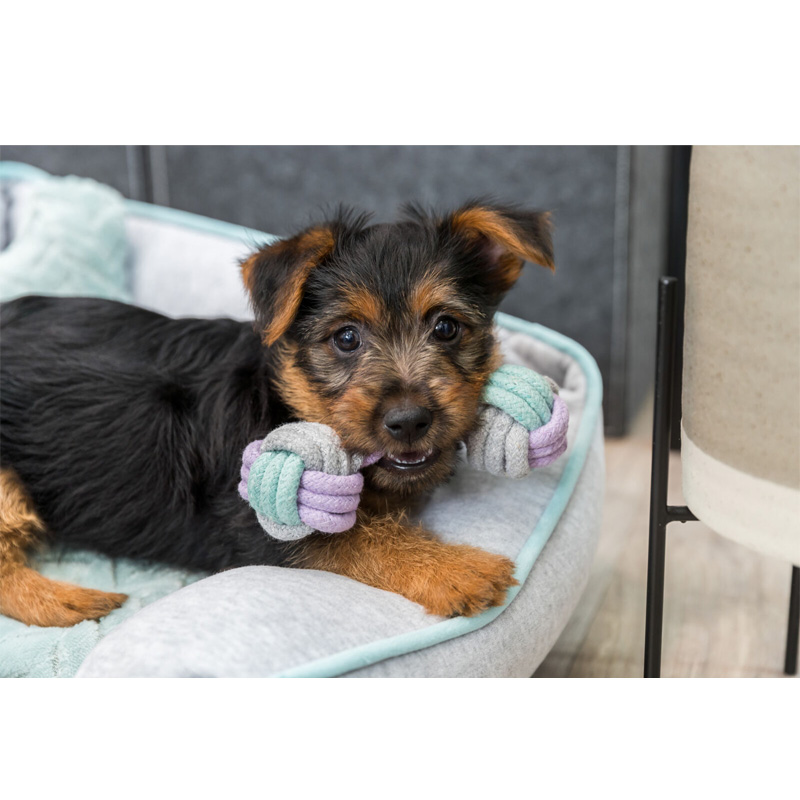 De Trixie Junior Halter Touw van 15 cm cm is hondenspeelgoed voor pups in de vorm van een geknoopte halter van katoen/polyester, met een bal aan elk uiteinde. Heerlijk om lekker mee te spelen, te gooien en op te bijten! Pups bijten graag op speelgoed en door de zachte structuur van deze halter kan dat veilig. Door de wrijving langs het gebit worden bovendien bacteriën van de tanden verwijderd en het gebit verzorgd.
