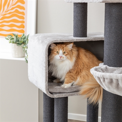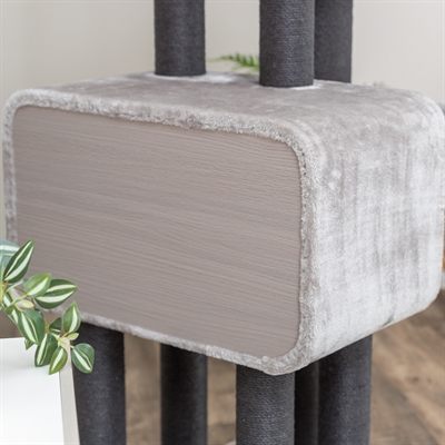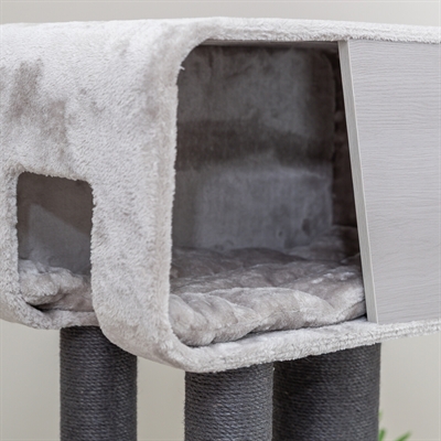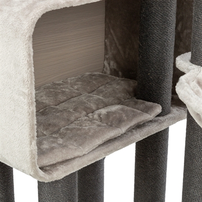 De Trixie Krabpaal Rafael XXL Lichtgrijs/Donkergrijs is een robuuste en stijlvolle krabpaal, speciaal ontwikkeld voor grote katten. Dankzij de extra dikke bodemplaat en stevige palen biedt deze krabpaal optimale stabiliteit, zelfs bij intensief gebruik. De palen zijn omwikkeld met duurzaam jute en de ligvlakken zijn afgewerkt met zacht pluche voor extra comfort. Bovenin bevindt zich een ruime slaapplek met een afneembaar, wendbaar kussen, terwijl de onderste verdieping een knusse schuilplaats biedt voor rustmomenten.