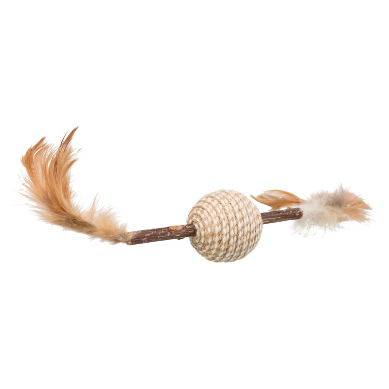 Dit Trixie Matatabi Spel Met Veren van 20 cm is kattenspeelgoed van natuurlijk materiaal met een ratel en een matatabi stokje als kern.