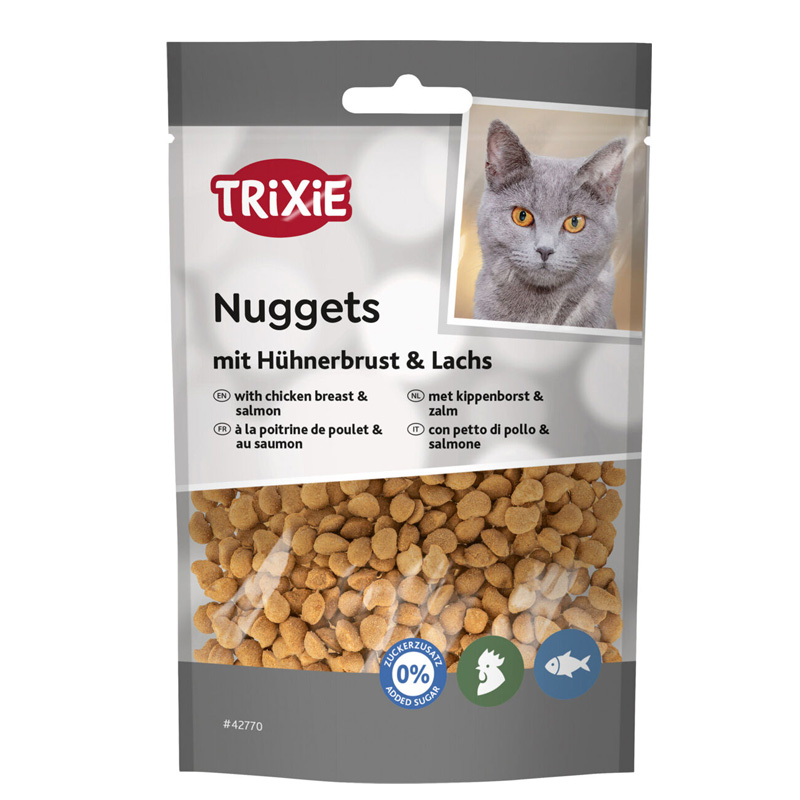 De Trixie Nuggets Met Kippenborst En Zalm is een smakelijke kattensnack die kip en zalm combineert in kleine, krokante stukjes. Dankzij de toevoeging van spirulina en taurine sluit deze snack goed aan bij het dagelijkse eetmoment, of juist als extra tussendoortje om jouw kat te verwennen. Een eenvoudige traktatie waar katten graag voor terugkomen.